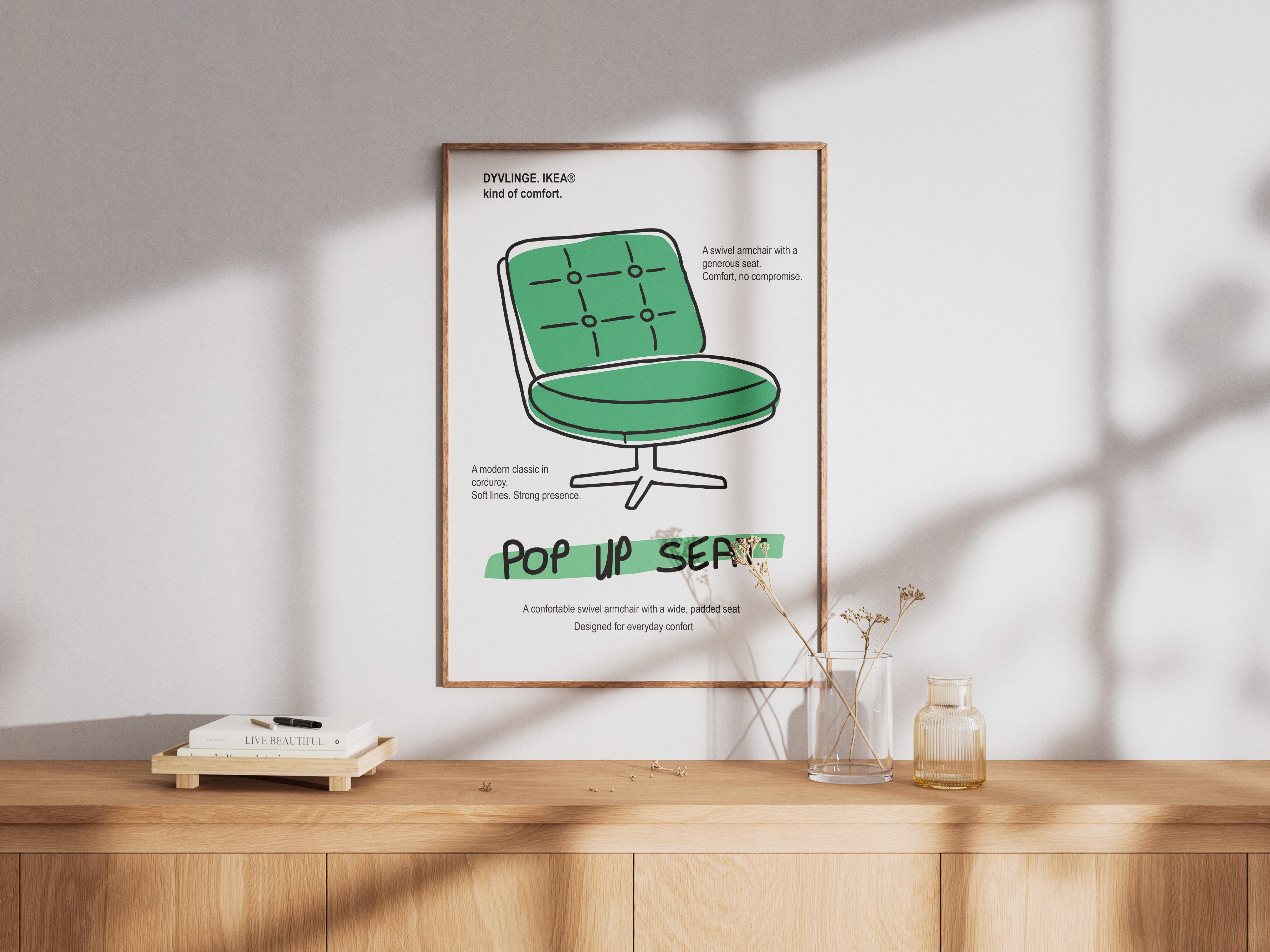 L’intention était plus émotionnelle que descriptive : célébrer ce que représente ce fauteuil dans un intérieur, et surtout pour la personne à qui ce poster est destiné. En simplifiant les formes et en adoptant un style plus brut, j’ai cherché à créer une affiche qui dépasse la simple représentation d’un objet pour en faire une interprétation personnelle et graphique.